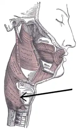 ![]() Muscles of the pharynx and cheek. (Constrictor pharyngis inferior visible at bottom left.) | |