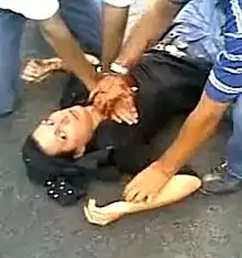 Her last words were, "I'm burning, I'm burning!" according to Panahi.[21] She died en route to Tehran's Shariati hospital.[14] However, the civilian physician who tended to Agha-Soltan in the video stated that she died on the scene.[38][39] Hejazi, standing one metre away from her when she was shot, tried to stanch her wound with his hands. Hejazi said nearby members of the crowd pulled a man from his motorcycle while shouting: "We got him, we got him", disarmed him, obtained his identity card and identified him as a member of the Basij government militia. The militiaman was shouting, "I didn't want to kill her." The protesters let him go, but they kept the alleged killer's identity card and took many photographs of him.[41] A recent documentary on the shooting contained a previously unseen clip of demonstrators capturing the militiaman seconds after the shooting.[42]