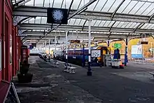 The bay platforms (1 and 2) as well as Platform 3 are covered by a partly glazed roof and directly accessible from the ticket office. Platform 4 is accessed via a subway and stairs, and afforded only a bus stop style shelter although it does have a departure board.