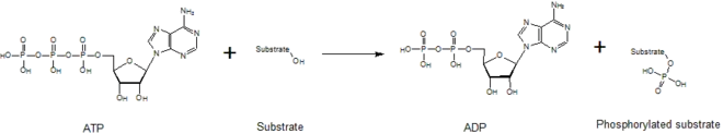 Kinases mediate the transfer of a phosphate moiety from a high energy molecule (such as ATP) to their substrate molecule, as seen in the figure below. Kinases are needed to stabilize this reaction because the phosphoanhydride bond contains a high level of energy. Kinases properly orient their substrate and the phosphoryl group within their active sites, which increases the rate of the reaction. Additionally, they commonly use positively charged amino acid residues, which electrostatically stabilize the transition state by interacting with the negatively charged phosphate groups. Alternatively, some kinases utilize bound metal cofactors in their active sites to coordinate the phosphate groups. Protein kinases can be classed as catalytically active (canonical) or as pseudokinases, reflecting the evolutionary loss of one or more of the catalytic amino acids that position or hydrolyse ATP.[5] However, in terms of signalling outputs and disease relevance, both kinases and pseudokinases are important signalling modulators in human cells, making kinases very important drug targets.[6]