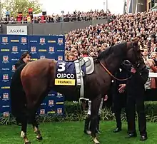 - Frankel – a bay horse sired by Galileo and foaled in 2008. Frankel was undefeated in fourteen starts and won £2,998,302 in prize money. He won the Group 1 Dewhurst Stakes, 2000 Guineas, St James's Palace Stakes, Sussex Stakes twice, Queen Elizabeth II Stakes, Lockinge Stakes, Queen Anne Stakes, International Stakes and Champion Stakes.[23] He was twice named Cartier Horse of the Year[24] and Timeform rated him as the best horse since the start of the company in 1948.[25] Frankel now stands as a stallion at Juddmonte Farm's Banstead Manor Stud for a fee of £200,000.[26]