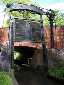 The wooden guillotine style gates are suspended in a slightly raked cast iron girder frame by a chain which passes through a small block on the gate. One end of the chain passes over two large wheels to a winch mechanism. The other end passes over two more large wheels to a hidden counterweight built into the side wall of the lock.[4] There was no need for paddle gear to fill or empty the lock. With such a small difference in water level a guillotine gate could easily be lifted to let water flow in and out.