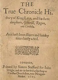 King Leir is an anonymous Elizabethan play about the life of the ancient Brythonic king Leir of Britain. It was published in 1605 but was entered into the Stationers' Register on 15 May 1594.[1] The play has attracted critical attention principally for its relationship with King Lear, Shakespeare's version of the same story.[2]