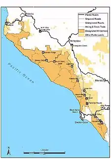 The King Range Wilderness is a 42,585-acre (172 km2) federally designated wilderness area within the King Range National Conservation Area in northern California, United States. The area was set aside with the passage of the Northern California Coastal Wild Heritage Wilderness Act of 2006 (Public Law 109-362). The Bureau of Land Management is the responsible agency and is currently working on a Management Plan for the King Range Wilderness.[1] This section of California's coastline is known as the "Lost Coast", a landscape too rugged for highway building, which forced the construction of State Highway 1 and U.S. 101 inland.[2] The King Range Wilderness is the longest undeveloped coast, outside of Alaska, in the United States.[3]