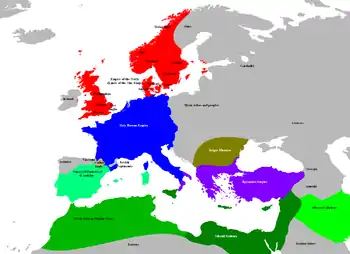 Map of Europe at the beginning of the novel. Shef's Empire of the North is denoted in red.
