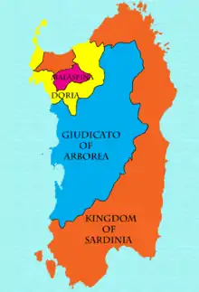 The realm was divided into four small kingdoms, the Judicates of Cagliari, Arborea, Gallura and Logudoro, perfectly organized as was the previous realm, but was now under the influence of the Papacy, which claimed sovereignty over the entire island, and in particular of the Italian states of Genoa and Pisa, that through alliances with the "judges" (the local rulers), secured their political and economic zones of influence. While Genoa was mostly, but not always, in the north and west regions of Sardinia, that is, in the Judicates of Gallura and Logudoro; Pisa was mostly, but not always, in the south and east, in the Judicates of Cagliari and Arborea.[24][25] That was the cause of conflicts leading to a long war between the Judges, who regarded themselves as kings fighting against rebellious nobles.[26][27]