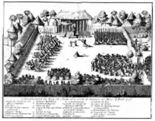 The king could field 200,000 men.[4] In comparison, other estimates range upward from twenty thousand, although contemporary interpretation is generally that these armies were of "overwhelming size". Battles were normally won by strength of numbers alone, with the weaker side fleeing.[7] The Whydah army in the 18th century was commanded by the governors of the 26 districts. The governors were expected to arm their men with weapons. Assou; Provincial governor and caboceer of the French fort at Whydah, could bring on to field 5–600 men as well as 4 French cannons. Another governor commanded 2,000 men whiles others could field 100, 200 or more men. Specialists existed in the army such as the Captain of the King's Musketeers. The Whydah army was divided into the left and right wings as well as the center which were further divided into platoons. In war, the first to go into action were the Musketeers who fought in the front ranks of the army. The archers followed suit and the army charged in after. The action culminated into hand to hand combat with swords, axes, and knives. Musketeers were employed around the late 17th century but they did not replace the spearmen, swordsmen and archers.[8]