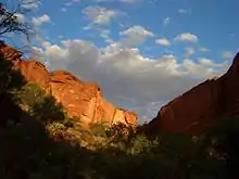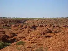 Three walks exist at Kings Canyon. The two km (return) and approximately one-hour Kings Creek Walk traces the bottom of the gorge. At the end of the walk is a platform, with views of the canyon walls above. The six km (loop) Kings Canyon Rim Walk traces the top of the canyon and takes three to four hours to complete.[1] A steep climb at the beginning of the walk, which locals call "Heartbreak Hill" (or "Heart Attack Hill", due to its steepness), takes visitors up to the top, with views of the gorge below and of the surrounding landscape. About half way during the walk, a detour descends to the Garden of Eden, a permanent waterhole surrounded by plant life. The last half of the walk passes through a maze of weathered sandstone domes, reminiscent of the Bungle Bungle. A slow descent brings the visitor back to the starting point. The loop can also be done in reverse (anti-clockwise), but the National Park Rangers encourage visitors to walk in one direction. Access to the walk may be restricted during hot weather.[2] The 22 km Giles Track connects Kings Canyon to Kathleen Springs and is popular with more adventurous hikers.