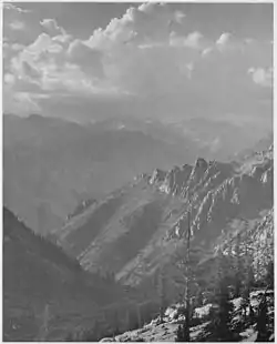 There are several prominent subranges of the Sierra within and around the park. The Palisades, along the park's eastern boundary, have four peaks over 14,000 feet (4,300 m) including the highest point in the park, 14,248 feet (4,343 m) NAVD 88 at the summit of North Palisade.[9] The Great Western Divide extends through the south-central part of the park and also has many peaks over 13,000 feet (4,000 m), including Mount Brewer.[10] The Monarch Divide, stretching between the lower Middle and South Forks of the Kings, has some of the most inaccessible terrain in the entire park. In the northwest section of the park are other very steep and rugged ranges such as the Goddard Divide, LeConte Divide and Black Divide, all of which are dotted with high mountain lakes and separated by deep chasms.