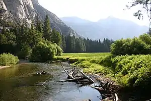 Zumwalt Meadow, one of the few large areas of flat land in the park, was formed by the accumulation of sediment behind the terminal moraine of a retreating glacier. In Kings Canyon there are in fact four such moraines, which the Kings River cascades over, forming whitewater rapids, in an area where it otherwise winds calmly across meadows. The series of moraines one behind the other are termed "nested moraines", each created during a different glacial period by glaciers of varying length.[18]: 147
