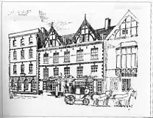 The King's Head Hotel is a hotel standing opposite the Shire Hall in Glyndŵr Street, Agincourt Square, Monmouth, Wales. It dates from the mid-17th century, and as one of the major inns in Monmouth was reputedly visited by Charles I of England in 1645. It has a fine black-and-white painted stone façade and became an important posting inn in the late 17th century, with a yard through an archway where visitors' horses could be stabled and where regular coach services called. In the 18th and 19th centuries, stagecoaches for London left from the inn. The range of buildings along Agincourt Street now includes the former Monmouth Bank and the County Club, while the inn itself is now part of the J D Wetherspoon pub chain. It is one of 24 buildings on the town's Heritage Trail and is a Grade II* listed building.[1]