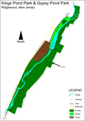 Kings Pond Park forms a forested greenway extending from just south of CR 87 Lake Ave at the Midland Park border to just north of Rock Rd at the Hawthorne/Passaic County border. Technically, Kings Pond Park is really two parks, Kings Pond Park, surrounding Kings Pond in north, and Gypsy Pond Park, encircling its namesake pond in the south. The main entrance to the park is on the east side of Lakeview Drive, but there are additional entrances, including a path running from the end of McKinley Place (off of nearby Mountain Ave). Another entrance is found along the Hawthorne border where an unmarked driveway enters the park from Rock Road, following the New York, Susquehanna and Western Railway.[1]