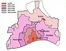 The parishes of Drypool, Marfleet, Sculcoates, and most of Sutton parish, were absorbed within the borough of Hull in the 19th and 20th centuries. Much of their area has been built over, and socially and economically they have long been inseparable from the city. Only Sutton retained a recognisable village centre in the late 20th century, but on the south and east the advancing suburbs had already reached it. The four villages were, nevertheless, distinct communities, of a largely rural character, until their absorption in the borough—Drypool and Sculcoates in 1837, Marfleet in 1882, and Sutton in 1929.[52] The current boundaries of the city are tightly drawn and exclude many of the metropolitan area's nearby villages, of which Cottingham is the largest.[53] The city is surrounded by the rural East Riding of Yorkshire.