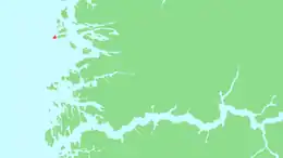 Kinn is an island in Kinn Municipality which is in Vestland county, Norway. The island lies about 12 kilometres (7.5 mi) west of the town of Florø. The neighboring island of Reksta (where the village of Rognaldsvåg is located) lies just 350 metres (1,150 ft) to the east of Kinn, the island of Skorpa lies about 2.5 kilometres (1.6 mi) northeast of Kinn, and the island of Askrova lies about 9 kilometres (5.6 mi) to the southeast. The 2.5-square-kilometre (0.97 sq mi) island is dominated by a large mountain, with all its residents living on the east side. The mountain, Kinnaklova, is a very notable landmark to sailors in the region since it has a deep ravine that cuts through the center of the peak.[1]