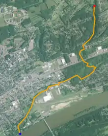 Kinney Run rises in Scott Township.[3] It heads through moderately steep or steep uplands along 5th Street Hollow Road before crossing 5th Street Hollow Road, passing a forested area[4] and U.S. Route 11 into a flood plain.[2][3] After crossing under U.S. Route 11, the stream goes through the Espy Bog.[4] The last 3.2 kilometres (2.0 mi) are on a flood plain. Here, the stream has a gradient of 0.002 meters downwards per meter. The flood plain that Kinney Run flows through is shared by another stream, called Unnamed Tributary Number 10.[3] Kinney Run then flows into Bloomsburg, passing by three wetlands and the Bloomsburg Town Park before emptying into the Susquehanna River at the end of Market Street.[4][5] Downstream of the point where Kinney Run crosses 5th Street Hollow Road, it passes by only two areas of steep slopes. Both of these areas are in Bloomsburg.[4]