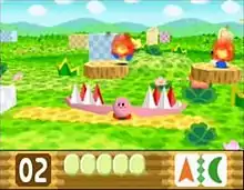 The game takes place across six worlds, which are split into several levels.[8] After the player selects a level, they must navigate it while avoiding enemies and obstacles. If Kirby or King Dedede touches an enemy or hazard, he loses health. Health can be replenished by eating food scattered across levels. If all health is lost or the character falls off the bottom of the screen or gets crushed by a moving object, the player loses a life. Losing all lives results in a game over. Players can earn lives by collecting stars or 1-ups.[3] Shards of the crystal are scattered about levels,[1] and while Power Combos are optional, they are required to collect several of the shards.[6] At the end of each level, players play a bonus game to collect food, stars, or cards with information about enemies.[1][3] Certain levels feature bosses that the player must defeat to proceed.[1] Players must collect all of the crystal shards to reach the game's final boss and true ending.[2]