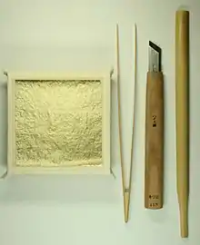 Two pieces of leaf (gold or silver, platinum) are heated over an ash-banked fire and bonded together. An additional bonding is then done to further strengthen the leaf and add thickness. Next, the bonded leaf is cut with a bamboo knife on a deer-skin-covered table, then affixed with glue (seaweed glue, funori and hide glue, nikawa, etc.) to the object to be decorated.