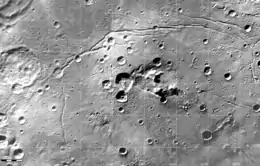 ![]() Kirk crater is in the center of this image. To its right is Clarke Montes. | |