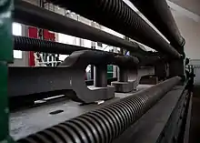 The testing machine is 47 feet 7 inches (14.50 m) long and weighs some 116 long tons (118 t). It works horizontally, the load applied by a hydraulic cylinder and ram. The working fluid is water not oil. The load is measured by a weighing system consisting of a number of levers with the final one carrying a jockey weight. The operator lets water into the hydraulic cylinder and as the pressure and hence load on the test piece increases the jockey weight is wound along to balance the hydraulic load. As it is wound it moves along a graduated scale and when the object under test fails the number on this scale is noted and multiplied by the weight to give the failure load.