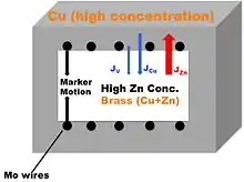 Macroscopic evidence for the Kirkendall effect can be gathered by placing inert markers at the initial interface between the two materials, such as molybdenum markers at an interface between copper and brass. The diffusion coefficient of zinc is higher than the diffusion coefficient of copper in this case. Since zinc atoms leave the brass at a higher rate than copper atoms enter, the size of the brass region decreases as diffusion progresses. Relative to the molybdenum markers, the copper-brass interface moves toward the brass at an experimentally measurable rate.[1]