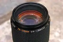 Originally, Kino Precision manufactured some of the now-famous Series 1 manual focus lenses under contract for Vivitar, a U.S. lens distributor of after-market film lenses for 35mm cameras. However, after the positive reception from consumers on Vivitar Series 1 lenses, and as Vivitar was using other Japanese lens manufacturers to produce Vivitar brand lenses, the company believed the time was right to successfully market lenses to fit existing 35mm Japanese film cameras under their own brand, Kiron. Kiron soon became known as one of the very few after-market lens manufacturers that could supply products equal to or even exceeding the optical and mechanical quality of the original manufacturer. In particular, the Kiron 28mm/2.0, the 105mm/2.8 1:1 macro,[2] the 28-210mm/4.0-5.6 and the 3.8-5.6 varifocal zoom, and the 28-85mm/2.8-3.8 varifocal macro zoom lenses were praised in contemporary reviews of the day for their superb optical resolution and clarity, as well as mechanical quality.[3][4][5]