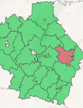 Kirsanovsky District (Russian: Кирса́новский райо́н) is an administrative[1] and municipal[5] district (raion), one of the twenty-three in Tambov Oblast, Russia. It is located in the east of the oblast. The district borders with Gavrilovsky District in the north, Umyotsky District in the east, Inzhavinsky District in the south, and with Rasskazovsky District in the west. The area of the district is 1,307.8 square kilometers (504.9 sq mi).[2] Its administrative center is the town of Kirsanov (which is not administratively a part of the district).[1] Population: 21,756 (2010 Census);[3] 23,613 (2002 Census);[7] 24,780 (1989 Census).[8]