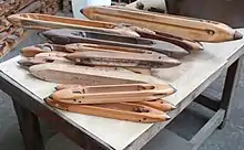 Shuttles were constructed from a dense heavy hardwood with metal tips. The wood was traditionally sourced from a box tree. Imported timbers such as persimmon and cornel were also commonly used. The shuttle was shaped and hollowed using conventional wood working techniques, and the metal tips are pressed onto the block. Strips of fox fur or similar were stuck to the inside of a shuttle to stop the thread ballooning as it left the pirn. There are many designs of shuttle. The Pemberton Loom needed a shuttle with a hinged shuttle-peg to hold the pirn; the later Draper loom shuttles clasped metal rings on the head of the pirn using a spring steel clip. The Draper Company claimed it had developed over 5000 different types of shuttle to meet "the needs of the mills and the whims of the weavers".[5][6]