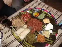 Kitfo cooked lightly rare is known as kitfo leb leb.[1] Kitfo is often served alongside—sometimes mixed with—a mild cheese called ayibe or cooked greens known as gomen. In many parts of Ethiopia, kitfo is served with injera, a flatbread made from teff, although in traditional Gurage cuisine, one would use kocho, a thick flatbread made from the ensete plant. An ensete leaf may be used as a garnish. Though not considered a delicacy, kitfo is generally held in high regard.