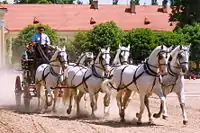 The Kladruber (Czech Starokladrubský kůň) is the oldest Czech horse breed and one of the world's oldest horse breeds. It is considered very rare. The chief breeder and the keeper of the studbook is the National Stud at Kladruby nad Labem in the Czech Republic where Kladrubers have been bred for more than 400 years. Kladrubers have always been bred to be a galakarossier – a heavy type of carriage horse for the court of the House of Habsburg.
