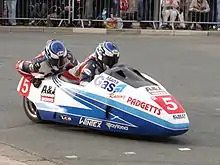 Klaffenböck and passenger Dan Sayle en route to victory in Sidecar Race A at the 2010 Isle of Man TT on LCR outfit