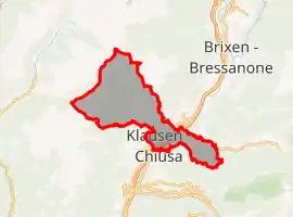 Klausen (German pronunciation: [ˈklaʊ̯sn̩]; Italian: Chiusa [ˈkjuːza]; Ladin: Tluses or Tlüses) is a comune (municipality) in South Tyrol in northern Italy, located about 20 kilometres (12 mi) northeast of the city of Bolzano.