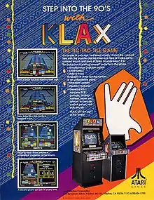 Klax is a puzzle video game released in arcades in 1990 by Atari Games while Namco distributed the game in Japanese markets. It was designed by Dave Akers and Mark Stephen Pierce. The object is to catch colored blocks tumbling down a machine and arrange them in colored rows and patterns to make them disappear. Klax was originally published as a coin-op follow-up to Tetris, about which Atari Games was in a legal dispute at the time.