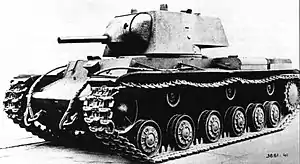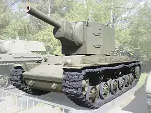 The Kliment Voroshilov (KV) tanks are a series of Soviet heavy tanks named after the Soviet defence commissar and politician Kliment Voroshilov who operated with the Red Army during World War II. The KV tanks were known for their heavy armour protection during the early stages of the war, especially during the first year of the German invasion of the Soviet Union. In certain situations, even a single KV-1 or KV-2 supported by infantry could halt German formations. The German Wehrmacht at that time rarely deployed its tanks against KVs, as their own armament was too poor to deal with the "Russischer Koloss" – "Russian Colossus".[4]