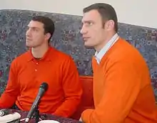 Vitali Klitschko (born 19 July 1971) and Wladimir Klitschko (born 25 March 1976), known as the Klitschko Brothers, are Ukrainian former professional boxers. During their peak years between 2004 and 2015, they were considered the dominant world heavyweight champions of their era, and among the most successful champions in boxing history.[1][2] In 2011, they entered the Guinness World Records book as the pair of brothers with most world heavyweight title fight wins (30 at the time; 40 as of 2020).[3][4] In the years following the retirement of undisputed heavyweight champion Lennox Lewis in 2004, the Klitschko brothers would eventually accumulate all four major world heavyweight titles.[2][5] Known for their exceptionally large physiques, they each developed a style that utilized their athleticism and arm reach to break down opponents.