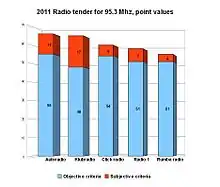 The parliamentary elections of 2010 caused a serious impact on the run of Klubrádió. The commercial station lost its financial integrity because many companies and agencies stopped advertising in Klubrádió for fearing of political consequences, and it almost went bankruptcy. After the victory of the right-wing party Fidesz securing the 2/3 majority in Parliament, Klubrádió became the number one enemy in the eye of the ruling party. In addition, in February, 2011, the broadcast license of Klubrádió expired but it continued broadcasting anyway due to temporary licenses, which were granted on a regular basis. Three tenders for three Budapest frequencies were advertised in mid-2011 with identical terms and conditions. Klubrádió have only submitted a tender offer for one of them, without providing a reason as to why it did not consider the others viable. The tender was preceded by intense lobbying for Klubrádió; various pressure groups tried to ensure that tender invitation is construed in such a way that only Klubrádió could win.[15] Klubrádió had issued several suggestions in open hearings before the tender was finalized. First, Klubrádió suggested that the frequency should be based on the premise of public service frequency, where the license fee might be zero forints. If the frequency were to be a commercial frequency, Klubrádió have suggested a license fee of 6 million forints.[16] During the actual tender, Klubrádió itself have offered to pay 55 million forints for the frequency, almost ten times of its original suggestion. This resulted in claims that the original Klubrádió suggestions were provocative.[17] However, according to the tender, the would-be winner of 95,3 MHz should be broadcasting mainly music and local news that implied the possible loss of Klubrádió knowing a talk and news station would not have a chance to be in accordance with the new premises. After closing the tender, Autorádió gained first place for 95,3 MHz with 66 points, because Klubrádió refused to bid for the other two frequencies with identical terms, this raised the possibility of losing a Budapest frequency.[18] Klubrádió came in second with 65 points, the pressure intensified to achieve overturning the decision. In Hungary, all tender decisions are subject to legal review, and when the management of Klubrádió launched a suit for the frequency, a court case began. Klubrádió did not argue that they should have received more points, rather they claimed that the winner's offer was „unrealistic” and should have been disqualified. Klubrádió added that they judged all bids over 53 million were „unrealistic”.[19] The argument would also disqualify Klubrádió's own bid of 55 million forints of yearly broadcasting fee. While the court case was still in progress, there were reports of more outside pressure trying to ensure Klubrádió's gain of the frequency. Klubrádió and the mainstream media also attacked the winners of the tender Autoradio for being a startup company without relevant experience in broadcasting, founded in early 2011, even though Monográf Rt, the owner of Klubrádió was just a month older at the time it acquired Klubrádió.