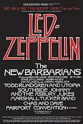 The Knebworth Festival 1979 consisted of two concerts performed by the English rock band Led Zeppelin and other artists at Knebworth House, Hertfordshire, England, in August 1979.