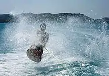 - Air (Ollie) - similar to the skateboarding trick of the same name, or a bunny hop in BMX, it is possible to jump without utilizing the wake. By pushing down against the water with your knees and simultaneously pulling the handle in provides more tension on the rope. Then pulling upwards with your legs, you can make the entire board leave the water. If this is combined with 'jumping' the wake, much greater heights can be achieved.