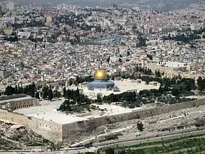 In 1119, the French knight Hugues de Payens approached King Baldwin II of Jerusalem and Warmund, Patriarch of Jerusalem, and proposed creating a monastic order for the protection of these pilgrims. King Baldwin and Patriarch Warmund agreed to the request, probably at the Council of Nablus in January 1120, and the king granted the Templars a headquarters in a wing of the royal palace on the Temple Mount in the captured Al-Aqsa Mosque.[12] The Temple Mount had a mystique because it was above what was believed to be the ruins of the Temple of Solomon.[13] The Crusaders therefore referred to the Al-Aqsa Mosque as Solomon's Temple, and from this location the new order took the name of Poor Knights of Christ and the Temple of Solomon, or "Templar" knights. The order, with about nine knights including Godfrey de Saint-Omer and André de Montbard, had few financial resources and relied on donations to survive. Their emblem was of two knights riding on a single horse, emphasizing the order's poverty.[14]