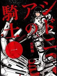 ![]() First volume cover of Knights of Sidonia by Tsutomu Nihei depicting the series' protagonist, Nagate Tanikaze, on top of the hand of his mecha, the Tsugumori. | |