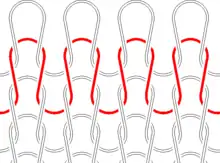 The topology of a knitted fabric is relatively complex. Unlike woven fabrics, where strands usually run straight horizontally and vertically, yarn that has been knitted follows a looped path along its row, as with the red strand in the diagram at left, in which the loops of one row have all been pulled through the loops of the row below it.