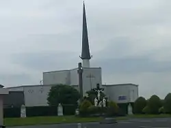 The Basilica of Our Lady, Queen of Ireland, at Knock is a Roman Catholic Church of the Latin Rite located in the small town of Knock, in County Mayo in the West Region of Ireland. It was designed in modern architecture style with concrete materials by architect Daithi Hanly, and completed in 1976. The basilica, which can accommodate approximately 10,000 people, serves the Roman Catholic Archdiocese of Tuam, and it is part of the Knock Shrine grounds that incorporates four other churches, including the Apparition Church, the place where, on Thursday evening of 21 August 1879, the Blessed Virgin Mary, Saint Joseph, and Saint John the Evangelist appeared, the old Parish church, the Blessed Sacrament Chapel, and the Chapel of Reconciliation. In this Ireland's National Marian shrine there are also a religious books' centre, a caravan and camping park, the Knock House Hotel, and the Knock Museum.