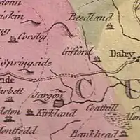 Blaeu's map of 1654, dating from Timothy Pont's survey of circa 1604, clearly shows the loch and erroneously indicates that its outflow entered the sea near Montfode. A dwelling named 'Iargan' is recorded and a 'Knokawart'.[12] Herman Moll's map of 1745 marks, but does not name the loch.[13] Roy's map of 1747 shows and names 'Loch Jargen', situated without an inflow burn.[14] Armstrong's map of 1775 does not show the loch, but Knock Jargon fort is clearly marked. William Aiton's map of 1811 shows a loch at Jargon, however, the outflow runs in entirely the wrong direction.[15] Thomson's map of 1832 marks and records Loch Jargon.[16]