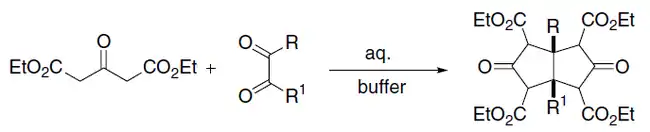 The Weiss–Cook reaction consists in the synthesis of cis-bicyclo[3.3.0]octane-3,7-dione employing an acetonedicarboxylic acid ester and a diacyl (1,2 ketone). The mechanism operates in same way as the Knoevenagel condensation:[10]