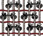 "The structural weft threads alternate with supplementary weft that rises from the surface of the weave at a perpendicular angle. This supplementary weft is attached to the warp by one of three knots...to form the pile or nap of the carpet."[2] Knots are tied in rows, one to each pair of warp threads, which may then be pushed down to make the rug more solid: "the interwoven warp and weft threads form the carpet's foundation, and the design comes from the rows of knots."[3] "In the knotted-pile...the arrangement of rows of weft is the dominant consideration."[4]