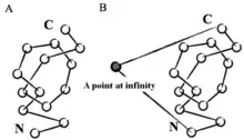 Mathematically, a knot is defined as a subset of three-dimensional space that is homeomorphic to a circle.[2] According to this definition, a knot must exist in a closed loop, while knotted proteins instead exist within open, unclosed chains. In order to apply mathematical knot theory to knotted proteins, various strategies can be used to create an artificial closed loop. One such strategy is to choose a point in space at infinite distance to be connected to the protein's N- and C-termini through a virtual bond, thus the protein can be treated as a closed loop. Another such strategy is to use stochastic methods that create random closures.