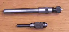 A diamond knurling tool with two of the interchangeable rollers shown above it