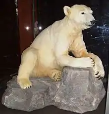 Knut's remains were exhibited in Berlin's Museum of Natural History, although this decision has caused some controversy with fans.[57][58] A full-sized sculpture covered in Knut's pelt was presented to the public on 16 February 2013. It went on display in the entrance hall of the museum where it was viewed free of charge until 5 May.[59] It will later be used for an exhibition on climate change and environment protection. Museum spokeswoman Gesine Steiner stated that "It's important to make clear we haven't had Knut stuffed. It is an artistically valuable sculpture with the original fur."[60]