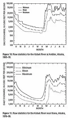 Flow records are available from USGS monitoring stations at Ambler and Kiana. Average annual flow for the Kobuk River at Ambler has ranged from 5,839 cubic feet per second (165.3 m3/s) to 14,890 cubic feet per second (422 m3/s) over the period of record 1966–78, with peak discharge ranging from 30,000 cubic feet per second (850 m3/s) to 95,000 cubic feet per second (2,700 m3/s). Near Kiana, average annual flow has ranged from 10,020 cubic feet per second (284 m3/s) to 24,960 cubic feet per second (707 m3/s) for the period 1977–99 with peaks of 45,000 cubic feet per second (1,300 m3/s) to 161,000 cubic feet per second (4,600 m3/s). Peak flows can result from large volumes of water released when ice jams fail.[2] Flow records are also available for Dahl Creek, a tributary of the Kobuk River with a confluence near the town of Kobuk.