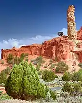 Evidence near the park suggests that Native Americans were the first to wander through the area. Around the turn of the 20th century, cattlemen from Cannonville and Henrieville used the basin as a winter pasture. In 1948 the National Geographic Society explored and photographed the area for a story that appeared in the September 1949 issue of National Geographic. They named the area Kodachrome Flat, after the brand of Kodak film known for its vibrant color rendition.[6] In 1962 the area was designated a state park. Fearing repercussions from the Kodak film company for using the name Kodachrome, the name was changed to Chimney Rock State Park, but renamed Kodachrome Basin a few years later with Kodak's permission.[6]