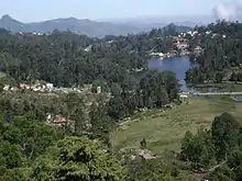 Kodaikanal lake View showing Mount Perumal, boat house, Carlton Hotel, Kodaikanal International School, fish hatchery, and Lake Road